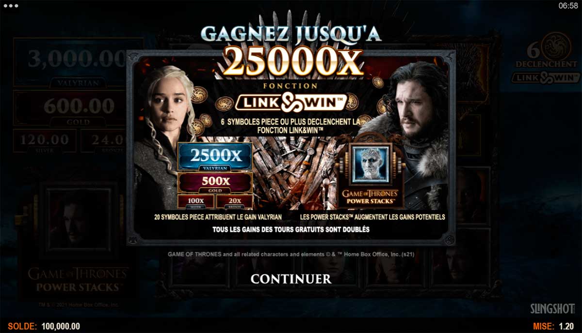 La machine à sous Game of Thrones Power Stack est un excellent choix pour les amateurs de slots à thème de série TV. L'expérience graphique et sonore a été soigneusement travaillée pour offrir une immersion totale dans l'univers de Westeros. Grâce aux fonctionnalités comme le Power Stack et le mode Link&Win, l'action est intense à chaque spin. Avec ses jackpots et ses multiples bonus, ce titre ravira aussi bien les fans de Game of Thrones que les joueurs à la recherche d'une machine riche en sensations fortes. Un must à essayer sans hésitation, sur desktop ou mobile.