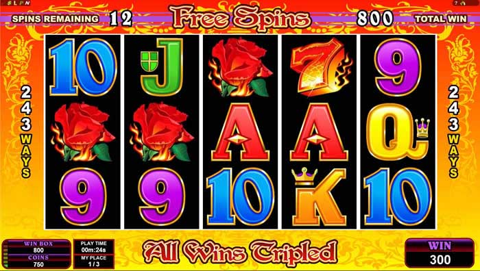 Le développeur de logiciels Microgaming permet aux joueurs de découvrir leur côté romantique avec le jeu Burning Desire. Le jeu offre aux joueurs sur 5 rouleaux 243 opportunités de gagner. Le symbole du diamant brûlant est particulièrement important pour les joueurs, car dès que 5 de ces symboles apparaissent à la suite, le jackpot de 3 000 pièces est gagné. De plus, le bonus activé par l’apparition de trois symboles de pièces ou plus (scatters) est très lucratif. Après avoir activé la fonction de bonus, les joueurs reçoivent 15 tours gratuits et tous les gains sont triplés. Il est également possible de réactiver la fonction bonus alors qu'elle est déjà en cours d'exécution.